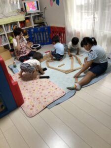 みんな仲良く木製プラレールで遊んでいます