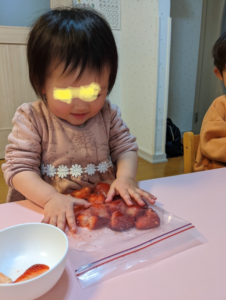 食育でイチゴを潰してイチゴジャムを作りました